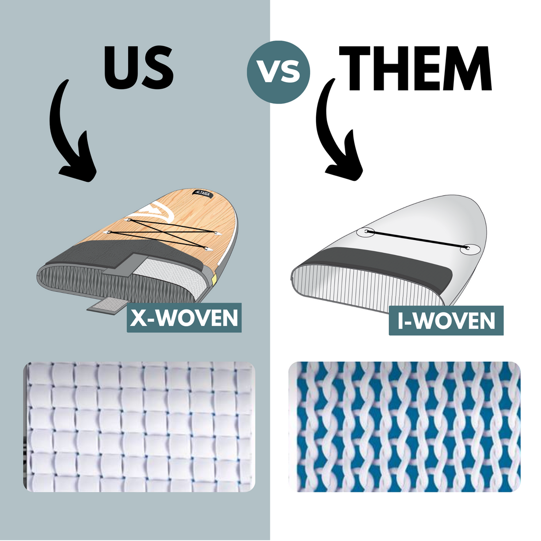 Our boards are built with high quality X-WOVEN DROPSTITCH technology combined with our unique STRINGER TECH & FUSION SKIN, which consists of 2 fiberglass stiffeners fused together on the top and bottom of the board. This type of construction provides outstanding stiffness without compromising weight. We’ve also added rail bands for improved torsional strength and rigidity.
