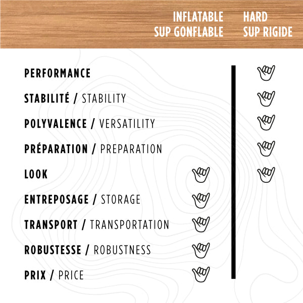 You will find many more options in terms of shape, profile, thickness, rail forms and volume with hard boards than with inflatables. Whether you want to do yoga, surf the waves, go for long rides or simply spend some time on the water in the summer, it's likely that you'll be able to find a hard SUP that'll meet your needs.