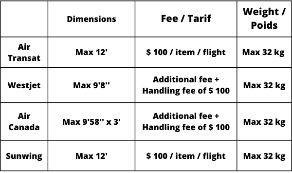 Most major airlines accept to transport sports equipment, but fees apply depending on the weight and dimensions of the board. To help you, we have listed the rates and dimensions allowed by some of the major airlines in Quebec.