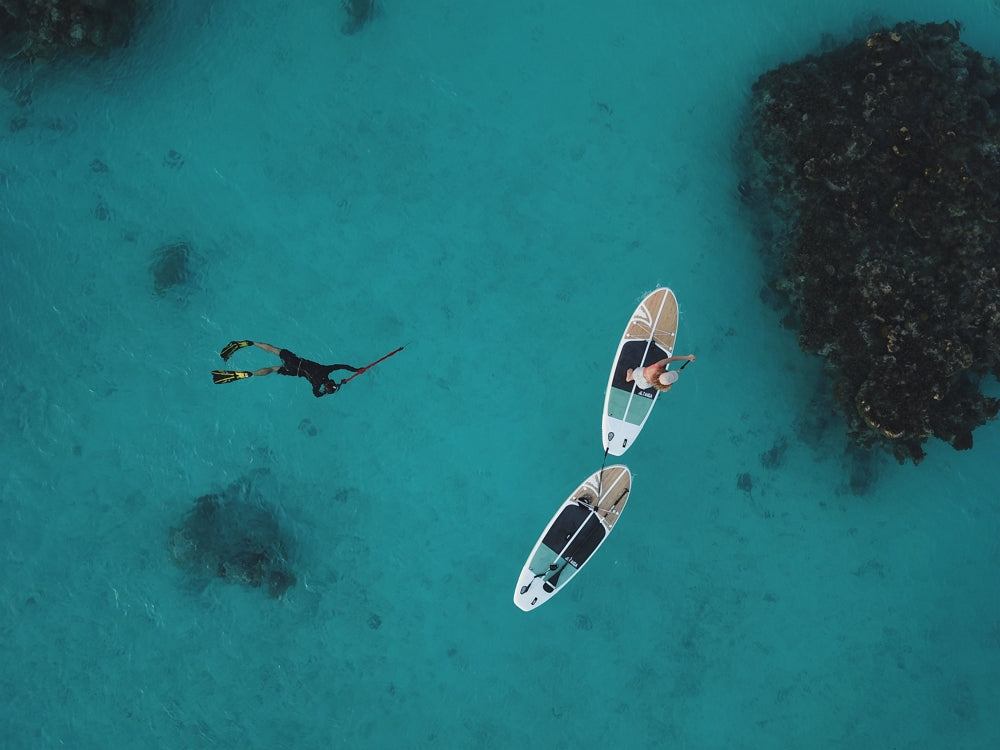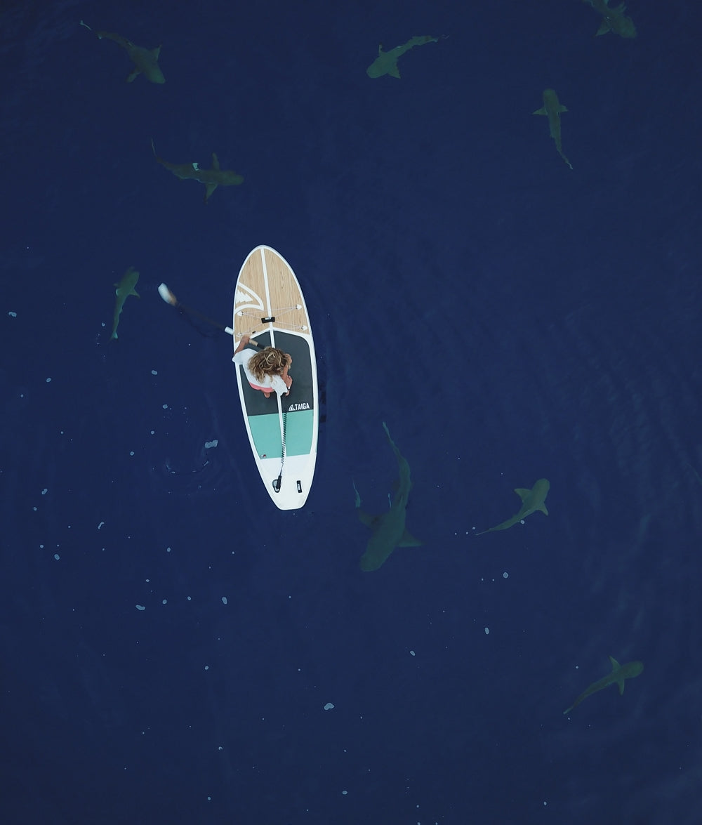 In Tetiaroa, Polynesia, an atoll 30 nautical miles north of Tahiti. There, the coral barrier has broken into immense blocks, and the power of the current at the exit of the pass creates whirlpools of all shades of blue. It's as beautiful for the eyes as it is exhilarating in terms of paddle technique in such lively water. At the mouth of the pass, it's a real buffet for sharks and the biggest fish.