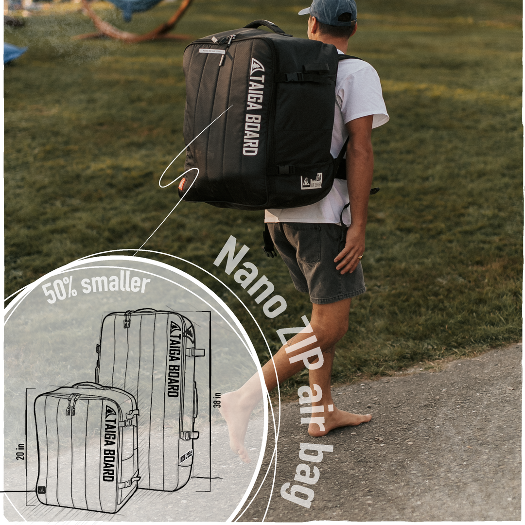 It's simple: it's 50% smaller and more compact than typical inflatable paddle boards sold online. Once properly stored in its bag, with its pump, paddle, and fins, the Nano Zip Air measures 22'' x 18'' x 12''. That's about the size of a carry-on.