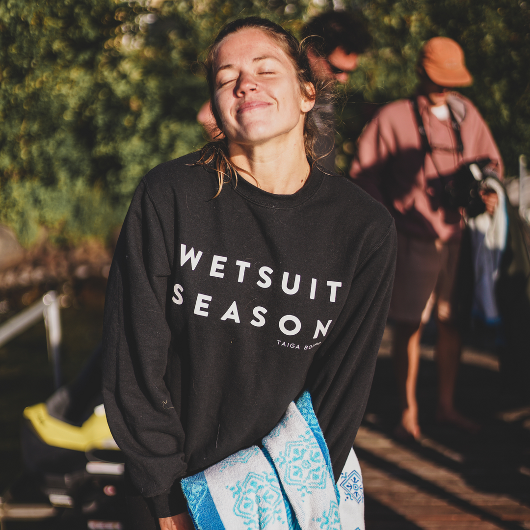 If it's really cold outside, you can also add a 2nd layer of clothing. We'll then finish it off with a windbreaker. Therefore, you fall in the water, you'll want to quickly put the top of your wetsuit to warm up, and then put your windbreaker over it. Keep your epic WETSUIT SEASON crewneck for after your session. Keep in mind that cotton is to be avoided. Cotton retains humidity and will keep you cold. No thanks!