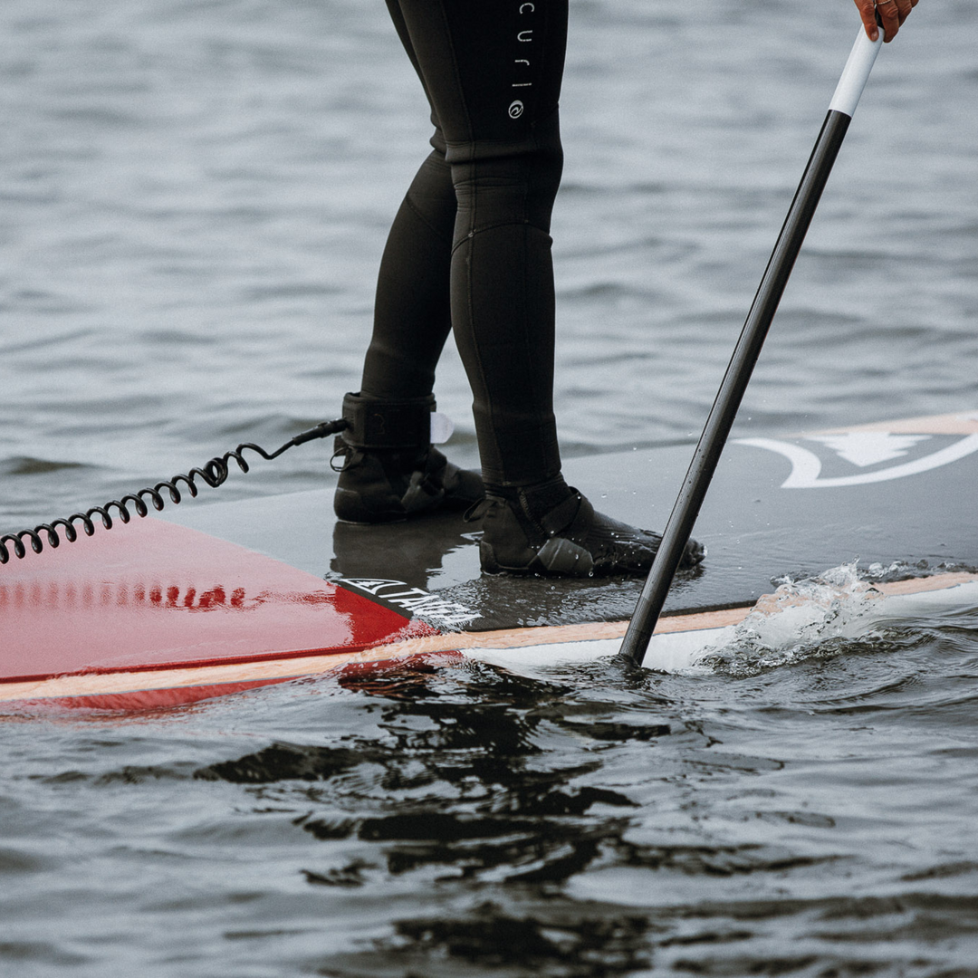 Let's agree, a wetsuit can feel bulky and uncomfortable when it's time to paddle board. It creates resistance on the shoulders and you get tired more quickly. Our solution? Put only the bottom of your wetsuit and bring it up to your hips. Don't wear the top. Instead, wear a thin base layer of merino wool or a synthetic fabric. Merino wool will keep you warm even when wet and synthetic fabrics will dry faster.