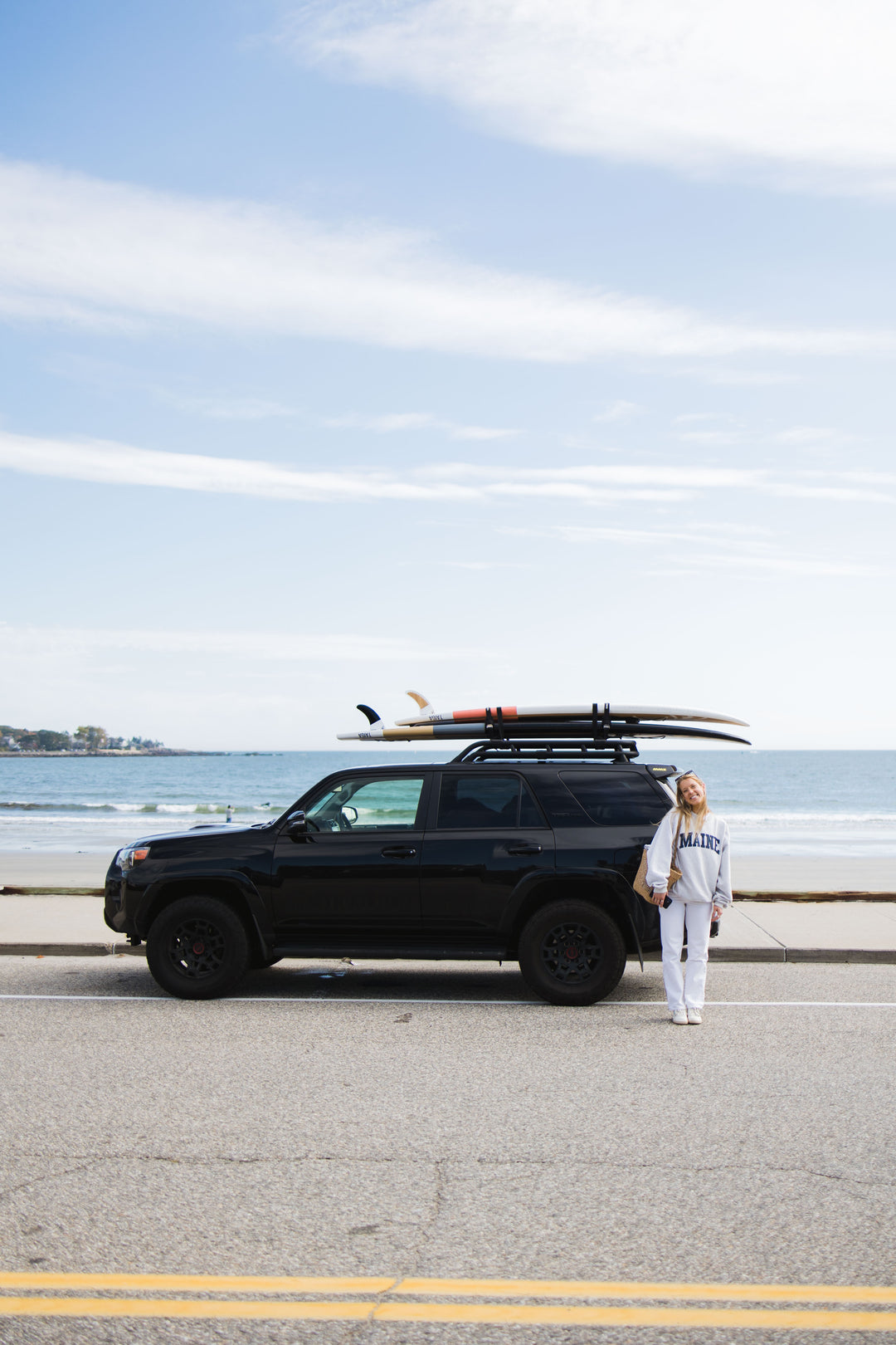 This configuration maximizes space by keeping the trunk clear while allowing full access to the roof box, enables the transport of multiple hard boards without compromising storage, and ensures that all equipment remains secure over long distances — made for a practical, comfortable, and safe travel experience.